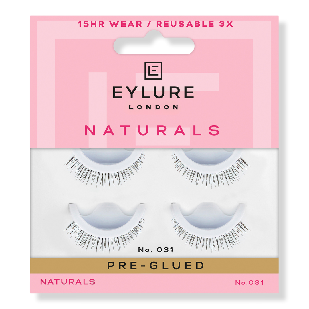 The Eylure Naturals Pre-Glued No. 031 Eyelash Twin Pack will give you a little extra length & fullness for a natural look that still makes an impact! With no glue, this pre-glued band has been developed to last longer than other pre-glued lashes, for up to 15-hour wear.