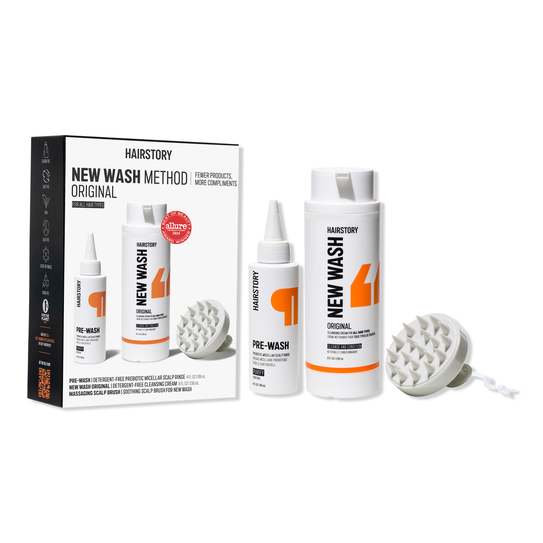 Get healthier hair and a happier scalp with the Hairstory New Wash Method Kit for All Hair Types. Step 1: Deep-clean with Pre-Wash. Step 2: Cleanse, condition and balance your natural oils with New Wash Original. Use the Hairstory Silicone Brush to boost both products' effectiveness.