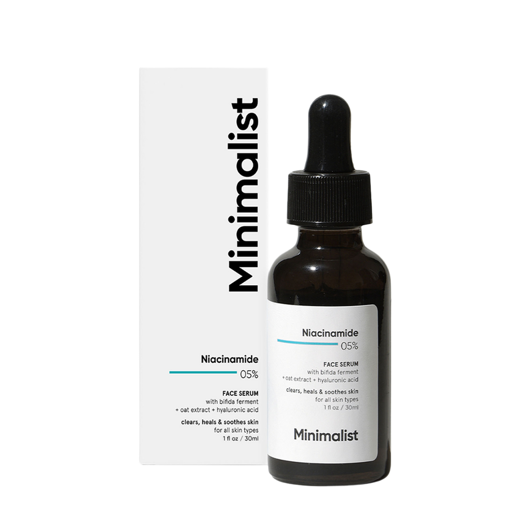 Minimalist Niacinamide 5% Face Serum for Clear Glowing Skin with 1% Hyaluronic Acid for Hydration.
