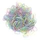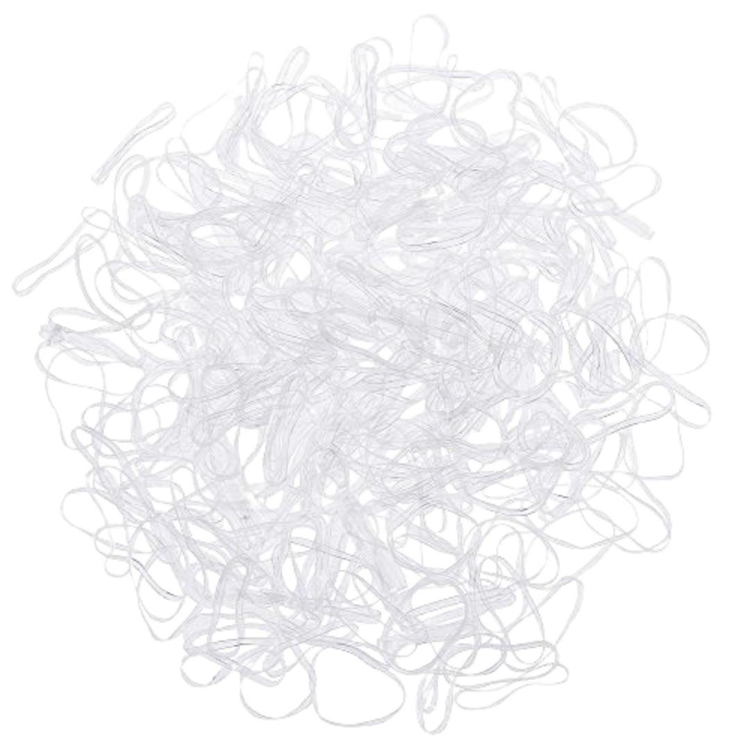 - This jumbo 200 count pack of small, snag free, clear elastics comes in a plastic sleeve for easy storage. The elastics are 2cm in diameter (all same size) and .3cm thickness. They are about the size and thickness of a Nickel.