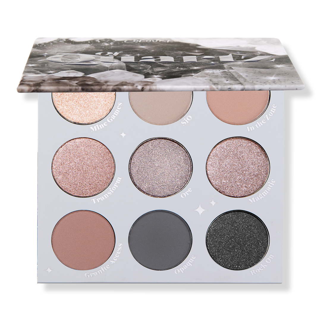 ColourPop's Of Quartz Pressed Powder Palette features 9 shades of icy champagne, pale grey, silver, gold, and charcoal in matte, matte sparkle and metallic finishes for the perfect soft, smokey eye.
