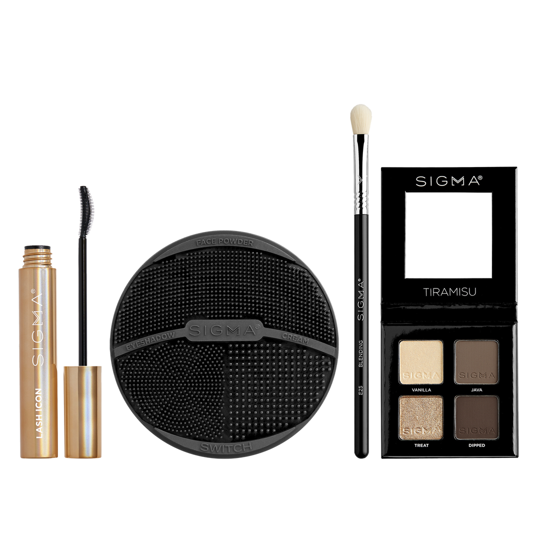 Use the E25 Blending Brush with the Tiramisu Eyeshadow Quad to apply and blend shades. Use the Sigma® Travel Switch to remove color from the brush between shades, allowing you to create a full eye look with just one brush. Finish with the Lash Icon Lengthening &Volumizing Tubing Mascara, using the curved side to coat and lift lashes from root to tip, and the flat side to define lower lashes.