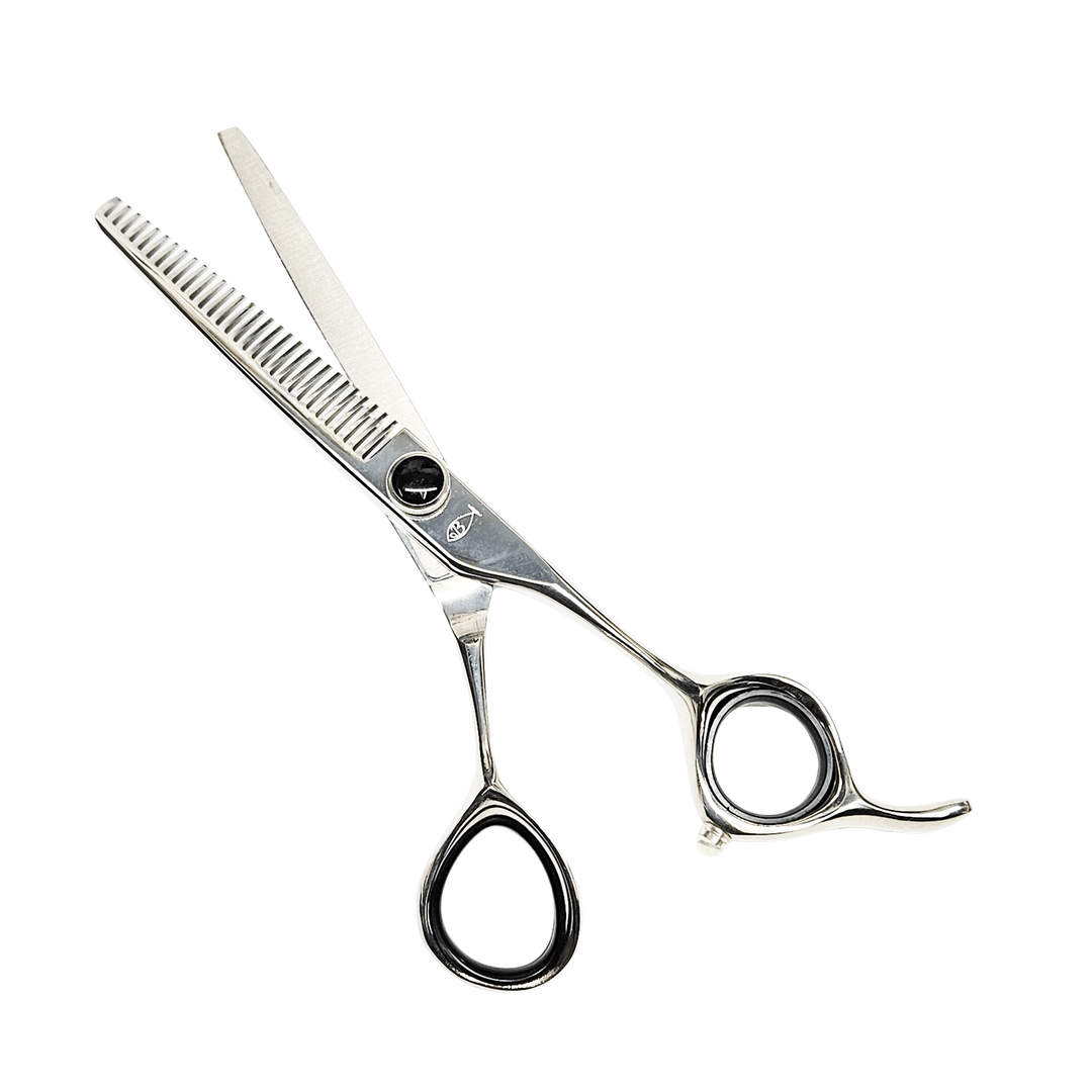 Blend with precision using the Panther Thinner. Featuring 30 V-shaped teeth and a smooth convex edge, this lightweight shear delivers controlled, seamless texturizing with a comfortable ergonomic fit.
