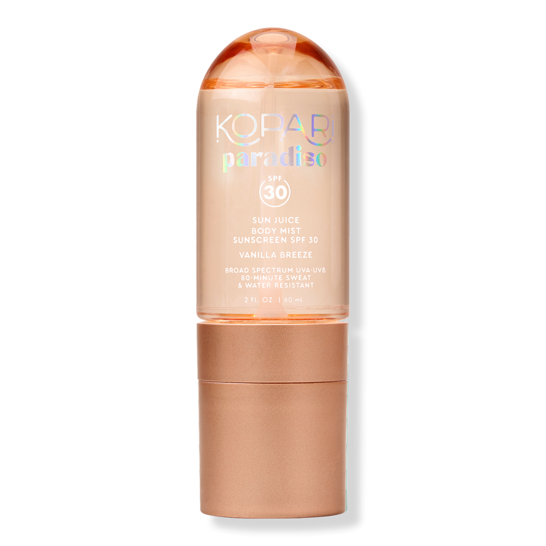 Kopari Paradiso’s Sun Juice Body Mist SPF 30 keeps you glowing, protected, and smelling oh-so-good. This clear, non-sticky mist makes SPF a total breeze - no white cast, just juicy scents, fresh-skin feel, and all-day sun protection wherever you go.