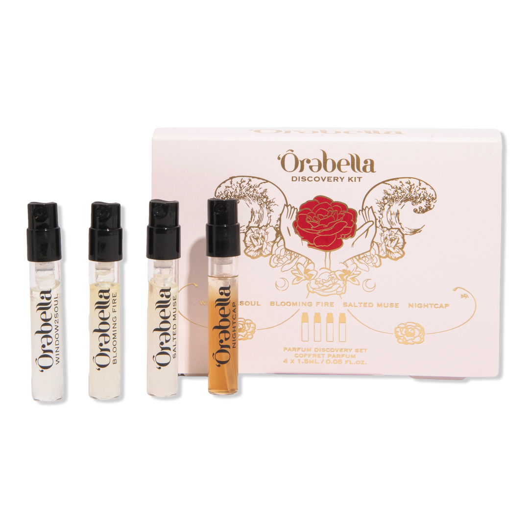 'Ôrəbella founded by Bella Hadid. This Parfum Discovery Set allows you to sample the entire skin parfum collection: sheer floral WINDOW2SOUL, warm floral BLOOMING FIRE, woody marine SALTED MUSE, and warm & spicy gourmand NIGHTCAP.
