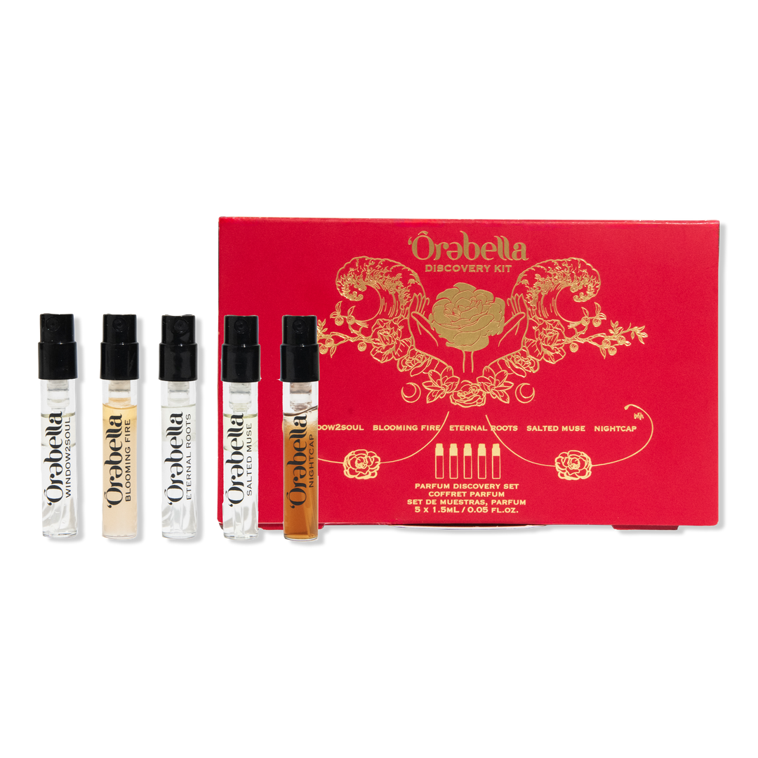 'Ôrəbella founded by Bella Hadid. This Parfum Discovery Set allows you to sample the entire skin parfum collection: sheer floral WINDOW2SOUL, warm floral BLOOMING FIRE, woody fruity ETERNAL ROOTS, woody marine SALTED MUSE, and warm & spicy gourmand NIGHTCAP.