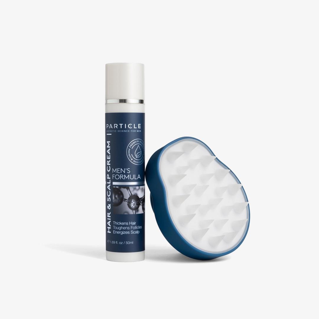 Wash your hair thoroughly before application, then use on dry or damp hair. Dispense a marble-sized amount of cream onto your fingers and apply it to your scalp. Hold Particle’s massager with one hand and use it to rub the cream into the scalp in a circular motion for approximately 30-60 seconds. Use once every three days morning or night. Wait several minutes before applying any hair-styling products.
