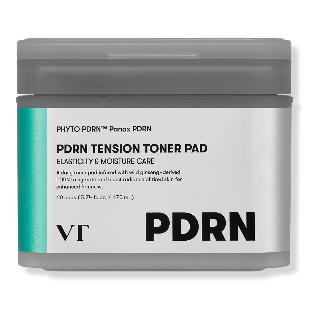 VT Cosmetics PDRN Tension Toner Pad is a daily toner pad infused with plant-derived PDRN from wild ginseng, providing firm hydration and radiant elasticity for tired, lackluster skin.