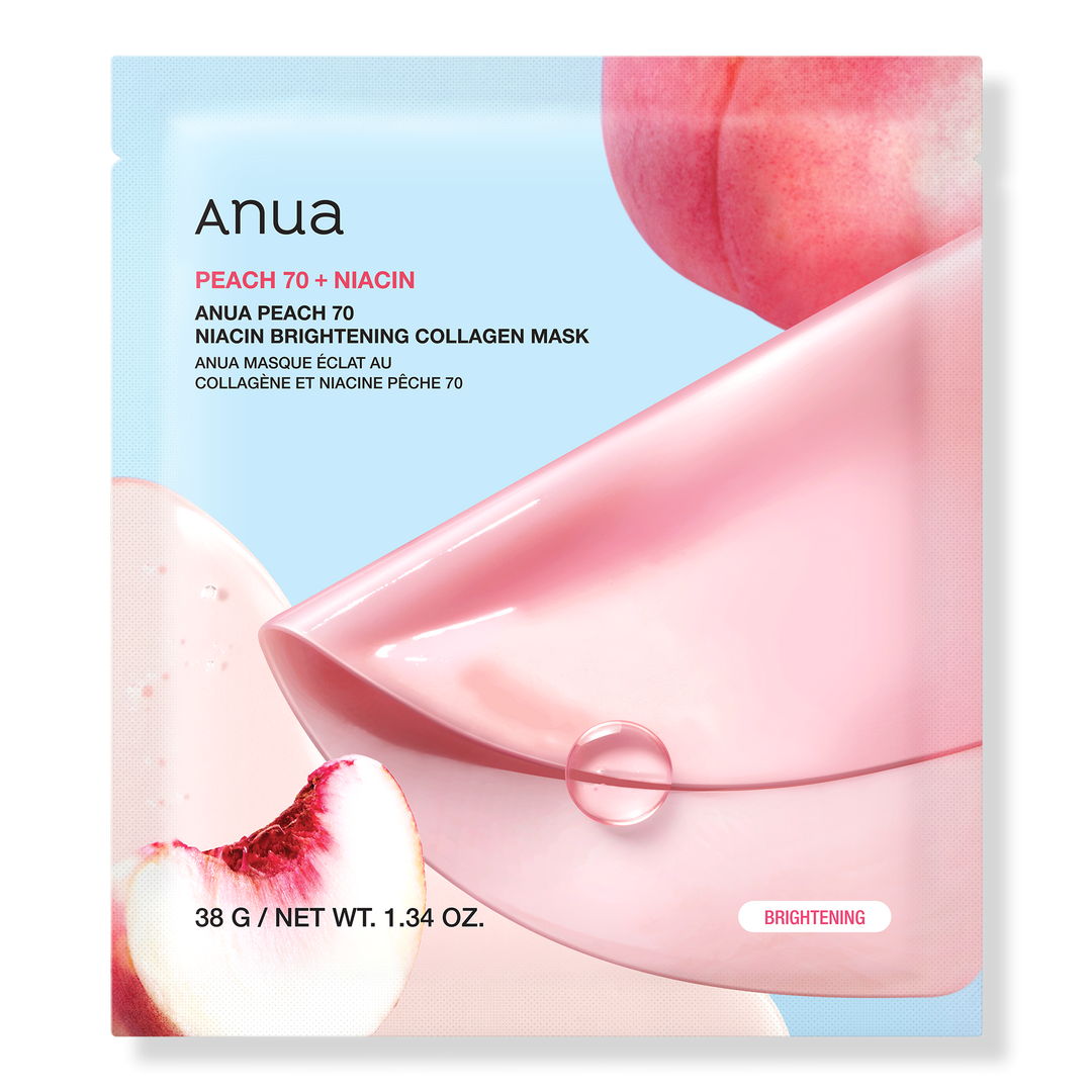 Anua Peach 70 Niacin Brightening Collagen Mask is color-changing with solidified essence to help the skin feel firmer and smoother, enriched with nourishing peach water.
