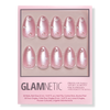Remove any previously applied nail polish. Wash and dry hands. Gently push back cuticles using the cuticle stick and sanitize nails with alcohol pads. Size Glamnetic nails by placing on finger and select sizes best suited for your natural nails. Apply an even layer of glue to natural nails and the back of Glamnetic nails. Align Glamnetic nails with cuticle line and apply at a downward angle. Press down firmly and hold for 10-20 seconds. Apply all 10 nails and if needed, file or clip to achieve desired shape.