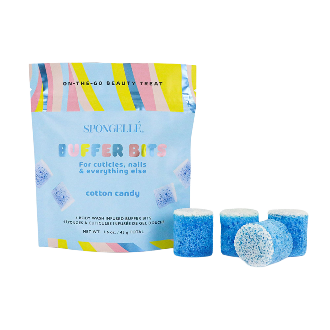 Our Mini Buffer Bits in Cotton Candy are a sweet extension of our PediPOP! Buffers. This dual-sided buffer cleanses & gently exfoliates cuticles, nails, & dry patches. Infused with triple butter & sugarcane extract, it features pomegranate, cherry blossom, and sugar musk for soft, silky-smooth skin.