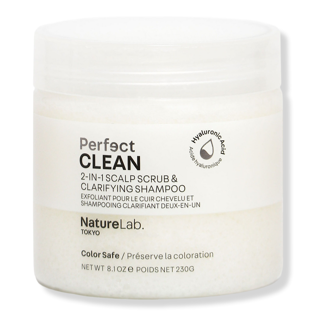 The NatureLab. Tokyo Perfect Clean 2-In-1 Scalp Scrub and Clarifying Shampoo gently removes product build up and environmental impurities to reveal healthy scalp and immensely shiny hair.