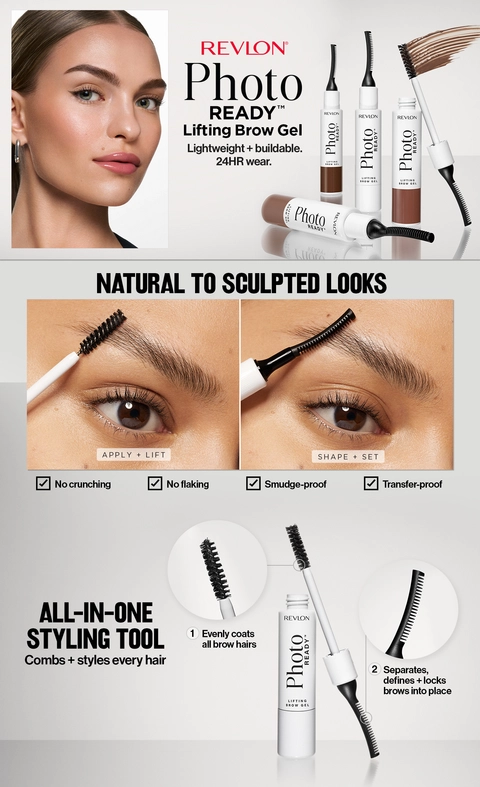 Instantly sculpts + lifts brows. Revlon PhotoReady Lifting Brow Gel creates any brow look, from natural to sculpted. No stiffness, crunching or flaking.
