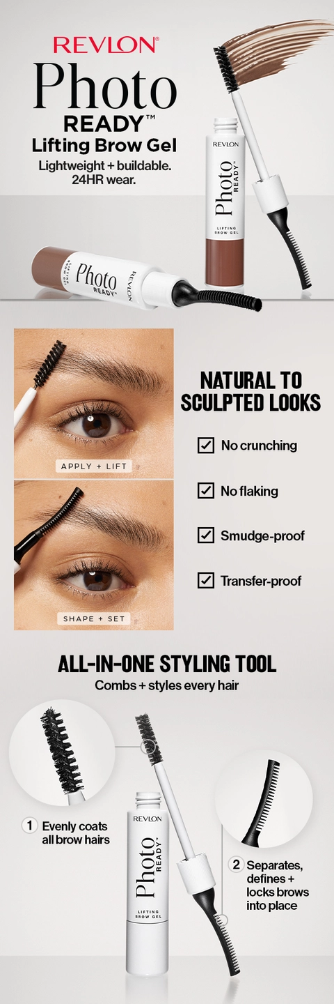 Instantly sculpts + lifts brows. Revlon PhotoReady Lifting Brow Gel creates any brow look, from natural to sculpted. No stiffness, crunching or flaking.