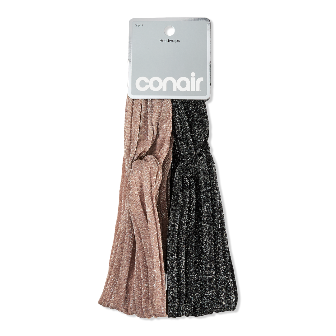 Two shimmery Conair headwraps feature a stylish turban twist. Black and blush bands sparkle with interwoven silver-tone threads for a comfortable, secure hold.