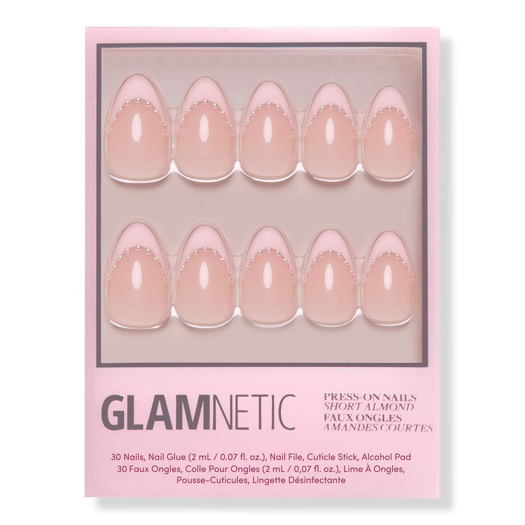Turn heads with Glamnetic Pink Me Up Press-On Nails. A pastel pink French tip elevated by a 3D pearl trim of that give these short almond nails a dreamy, high-glam finish that’s equal parts delicate and divine.