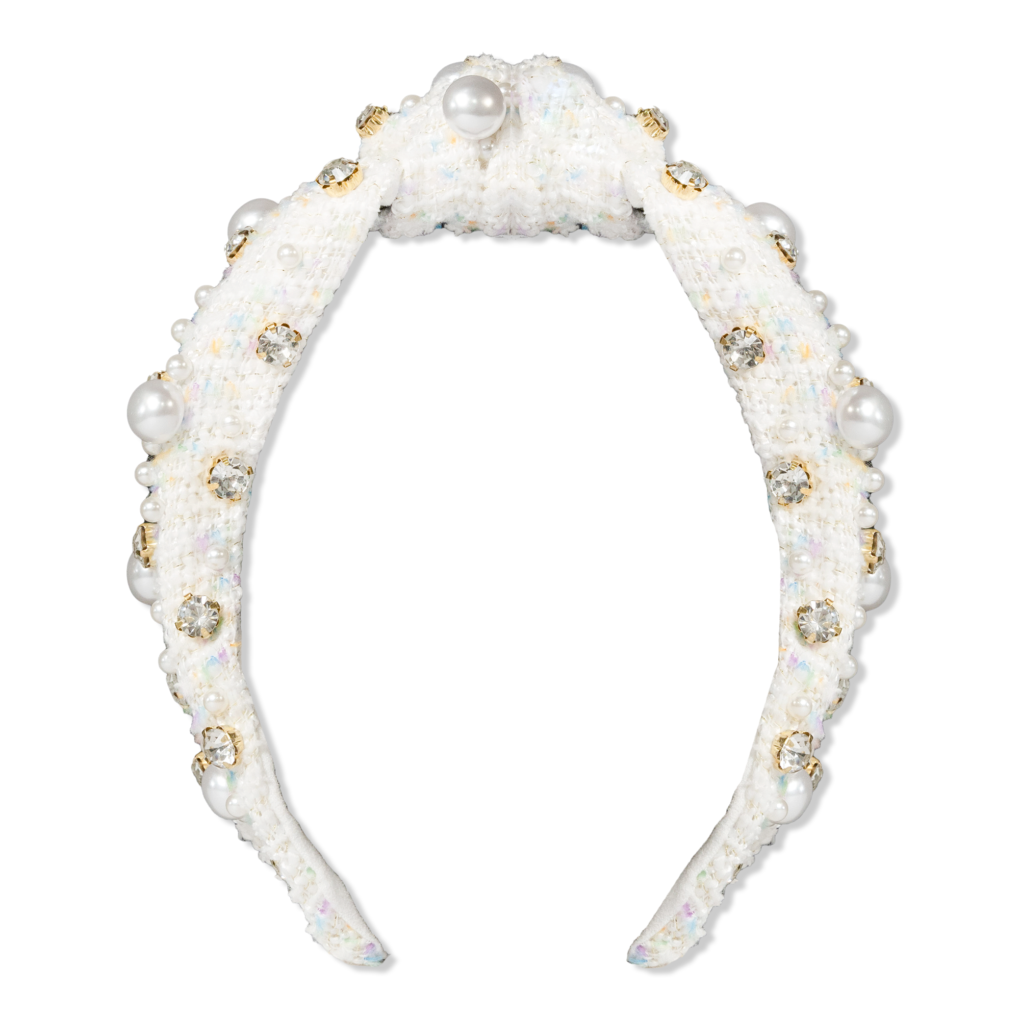The Plaid & Pearl Headband by Locks & Mane features luxe plaid fabric adorned with glimmering pearls and gold-toned crystals.