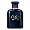 - A luxurious dark blue fragrance bottle accented with a vintage white Polo 67 logo and topped with a metallic blue cap.