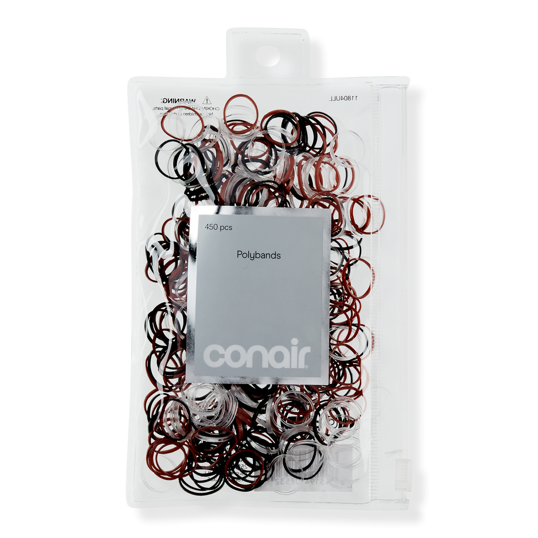 Meet the must-haves for versatile hairstyling: Conair polybands. With 450 clear, brown, and black hair ties in a resealable pouch, you'll have plenty for securing mini braids and ponytails.