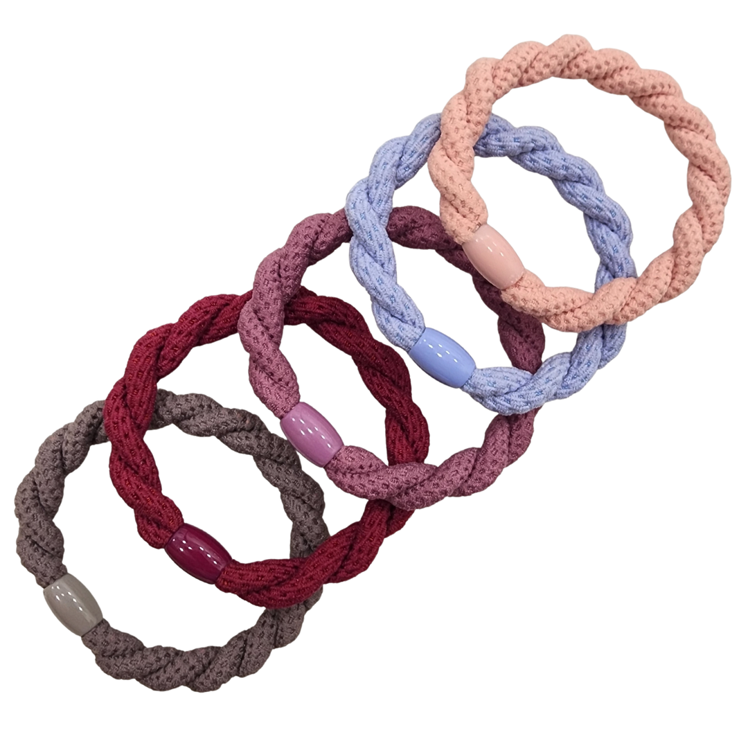 The Wildberry Scone Ponytail Holder Set features five vibrant, durable holders inspired by the colors and warmth of wildberry scones, all neatly stored in a clear cylindrical case. These stylish and comfortable elastics add a playful, charming touch to any hairstyle while keeping hair secure.