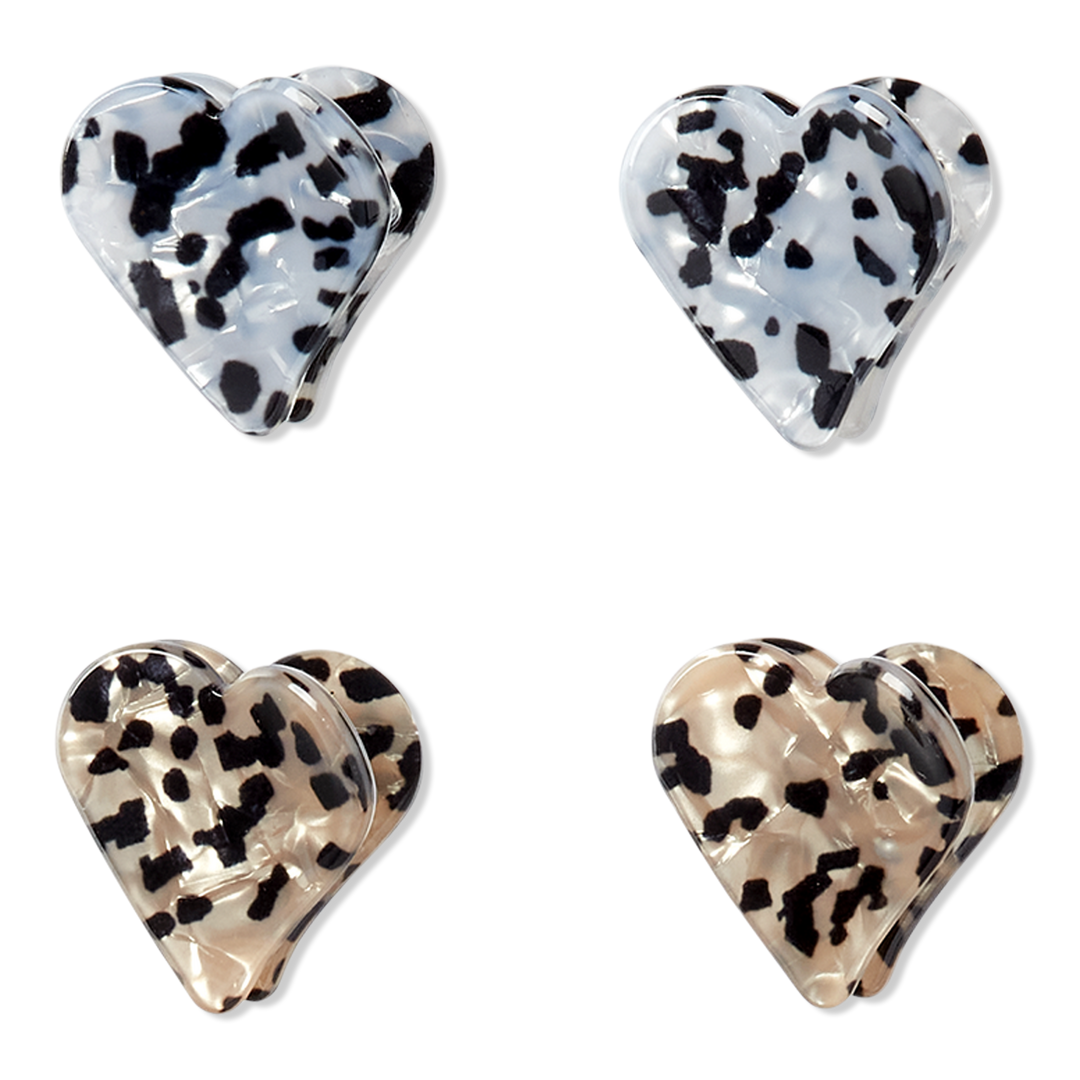 Scünci mini tort heart claw clips offer a secure all-day hold with a touch of fun for fine to medium hair. This 4-piece set includes silver and tan clips covered with black speckles, perfect for mixing and matching to create a unique look.