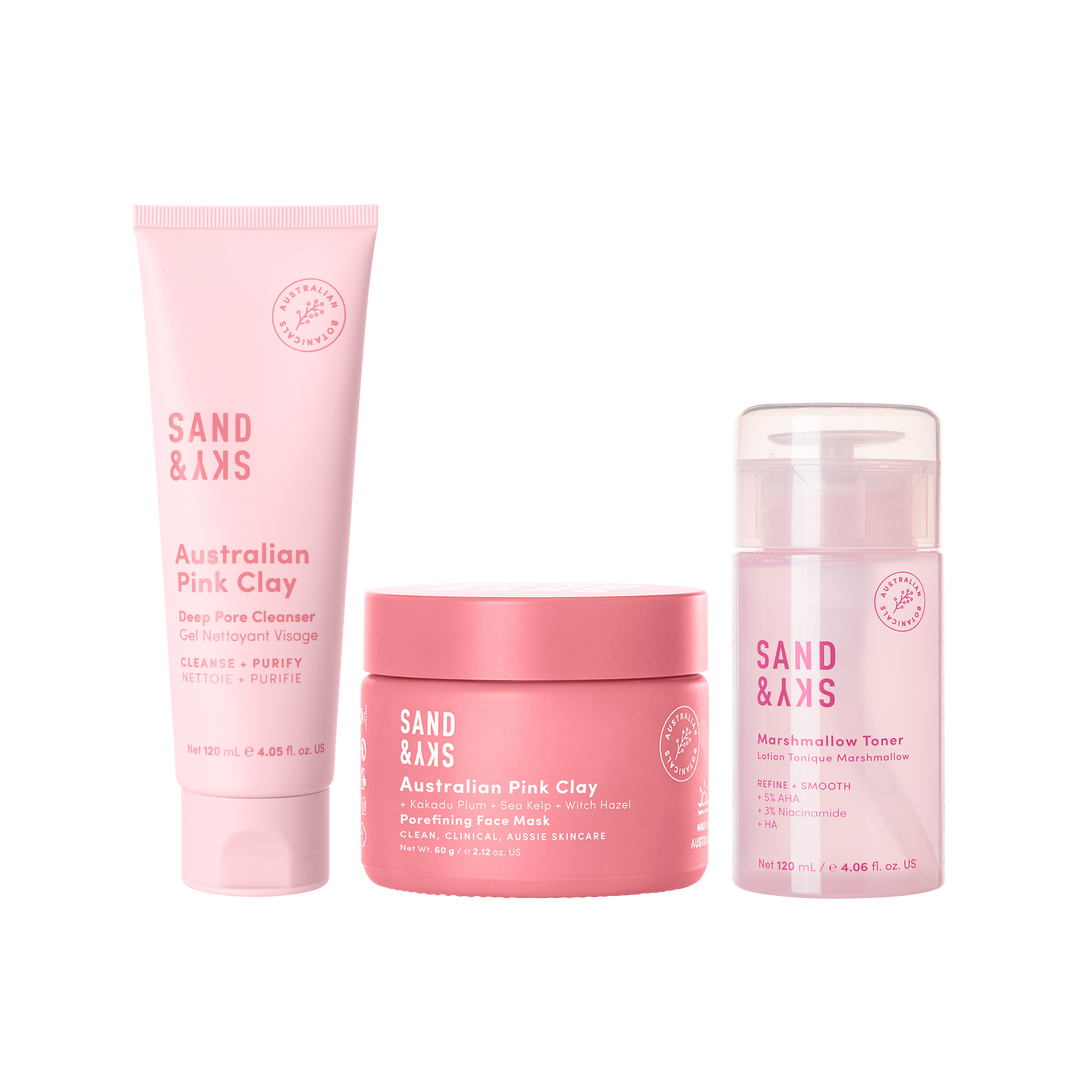 A three-step routine for refined pores and smoother skin. The Deep Pore Cleanser detoxifies with Finger Lime AHA, the Porefining Mask tightens pores with Vitamin C and the Marshmallow Toner soothes and strengthens with Niacinamide.