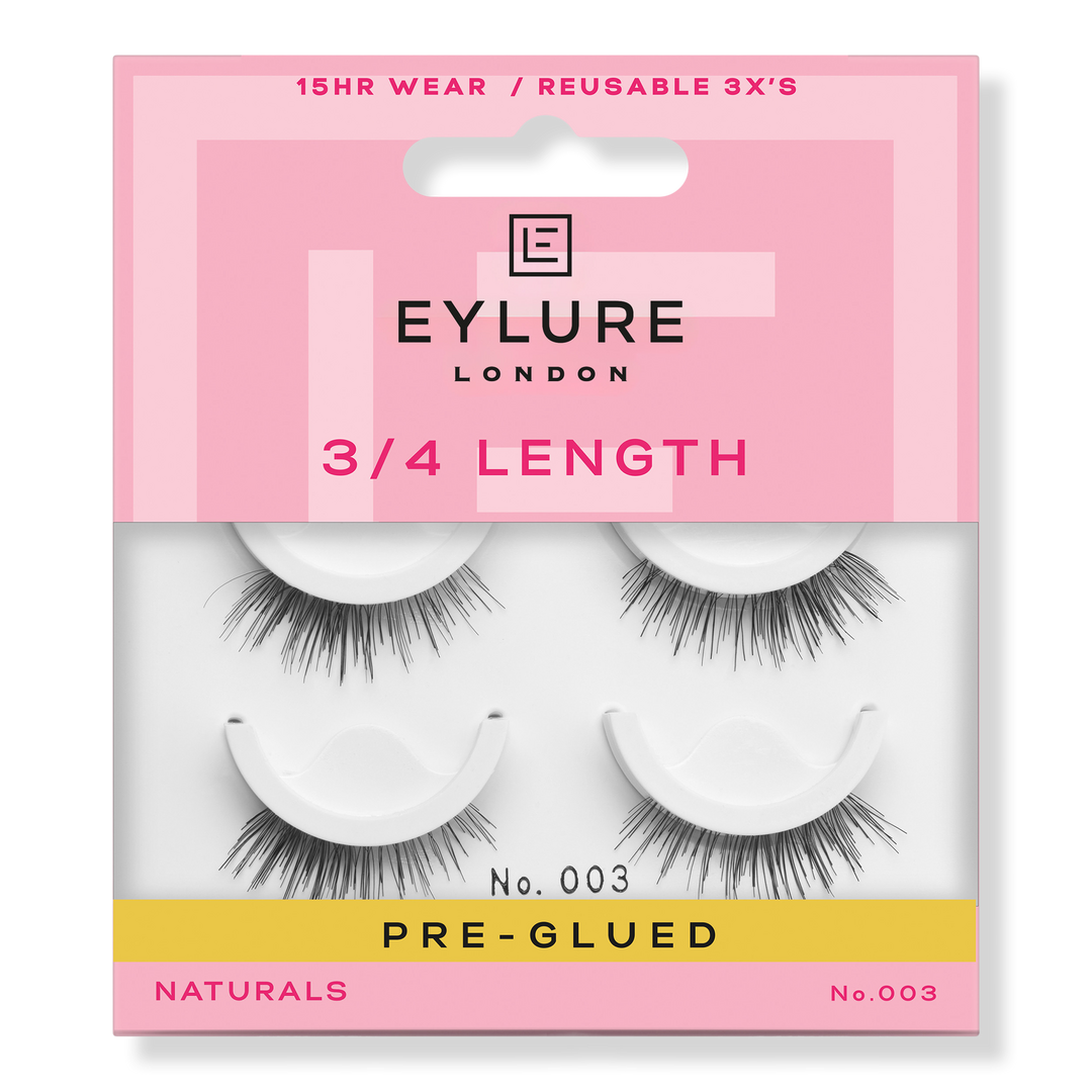 Say goodbye to the mess of glue when you wear the cute, natural, and comfy Eylure Pre-Glued Light & Wispy No. 003 Eyelashes Twin Pack. Includes a cushioned black band for a comfy fit and built-in liner look. The pre-glued band is designed for 15-second application and 15-hour wears.