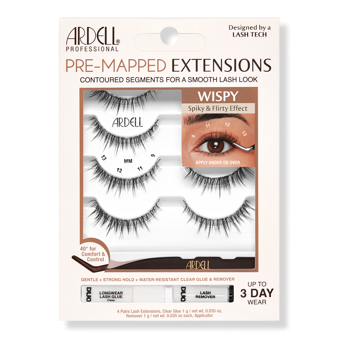 Ardell's Pre-Mapped Extensions take the guesswork out of creating today’s most popular styles. Professional lash techs designed the ideal map with graduating lengths that progressively elongate toward the outer corner for an upswept effect