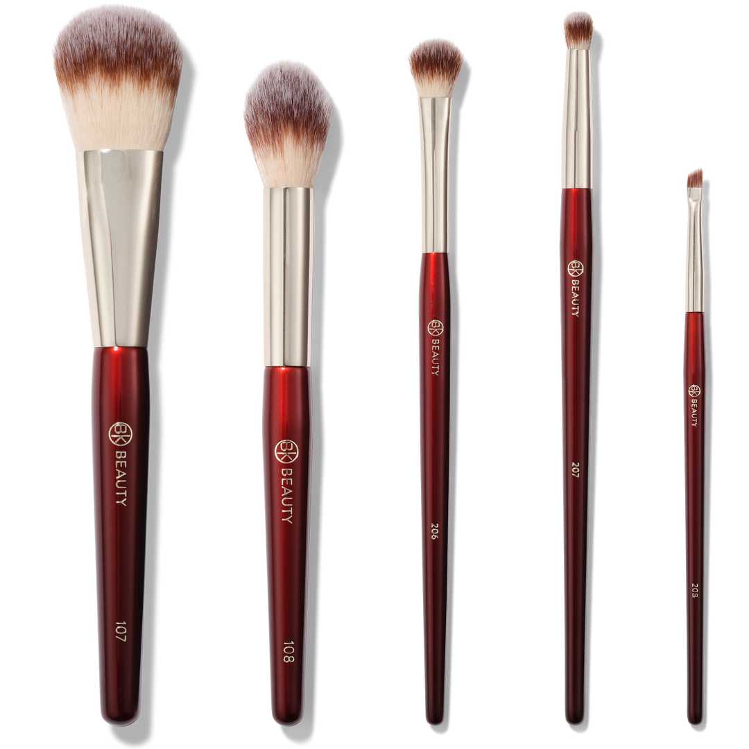 Five pro-inspired brushes for precise blending and targeted application: 107 Flat Blush, 108 Precision Powder, 206 Blending Shader, 207 Pencil Blender, 208 Precision Angled.