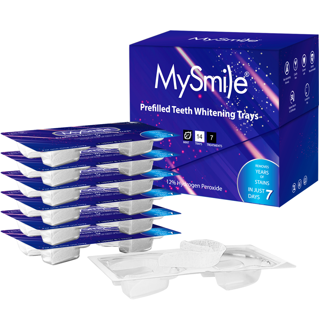 - PREFILLED DESIGN WITH ENHANCED WHITENING POWER: MySmile Teeth Whitening Trays combine a unique material and 12% hydrogen peroxide for enamel-friendly whitening. They provide quick, convenient results for a youthful, stain-free smile at home.