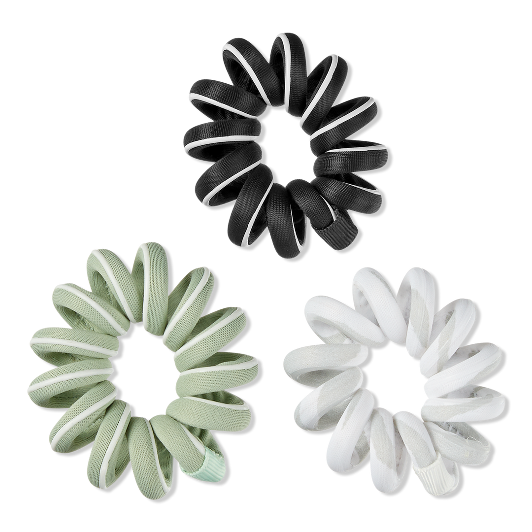 Soft and sporty scünci Prep chunky fabric-wrapped spirals come in green, black, and gray with white swirl. With a No-Slip Grip and gentle hold.