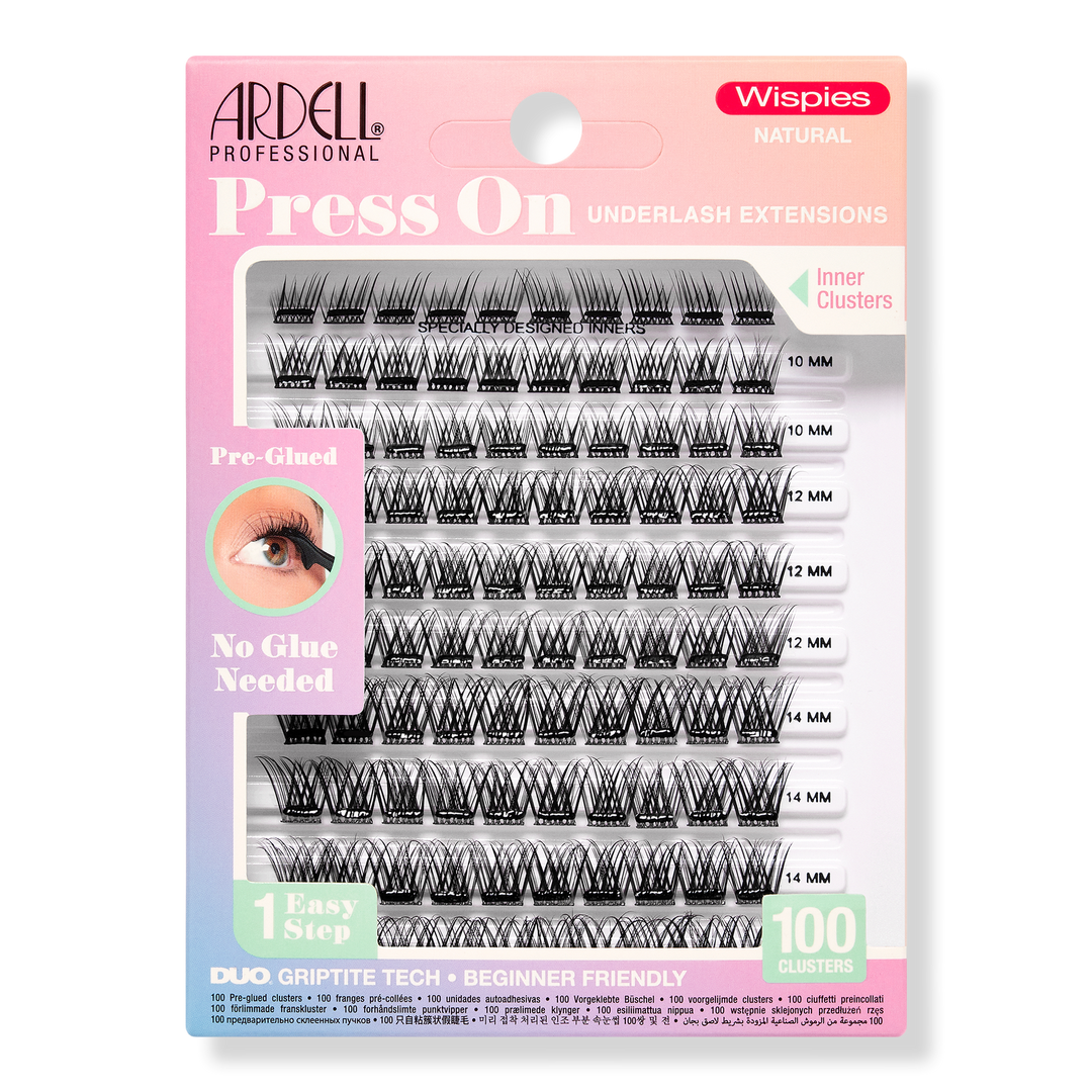 Underlash in under a minute with Ardell Press-On Wispies Natural - now in a 100 count set. No glue, no fuss, no muss. Press-On extensions go under natural lashes so band can’t be seen. Wispies’ flared silhouette defines your eyes with dark and delicate fibers that crisscross in a V-pattern.