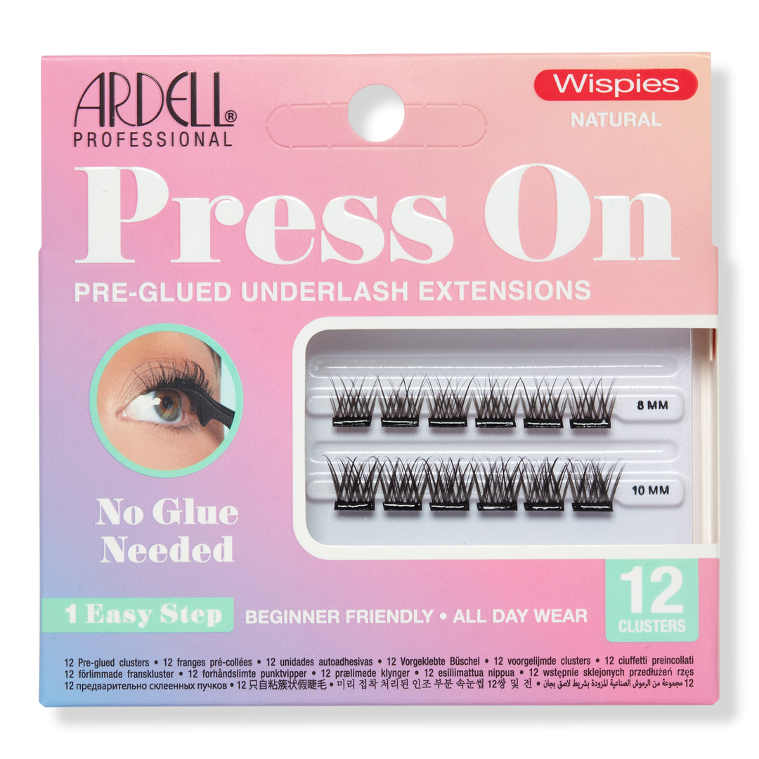 Ardell Press On Wispies Mini, Natural lashes hold all day with no glue and no fuss. Wispies’ flared silhouette defines your eyes with dark and delicate fibers that crisscross in a V-pattern for a natural volume finish in two lengths, 8mm and 10 mm.