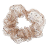 I have curly hair and wear scrunchies often for a big bun. But the gems on this fall off super easily once you twist it twice, and I've only worn it once for that reason. It has AB/rose gold gems on pink mesh. I think this scrunchie only works best on top of a bun that's already styled. (I guess that's because the gems are just lightly glued onto mesh.) It's cute for that reason, but I probably wouldn't buy this again.