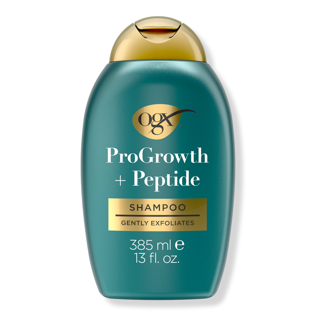 Gentle exfoliating OGX ProGrowth + Peptide Exfoliating Scalp Shampoo with 1.5% Mandelic Acid for gentle exfoliation to remove build-up, unclog follicles & support natural growth.