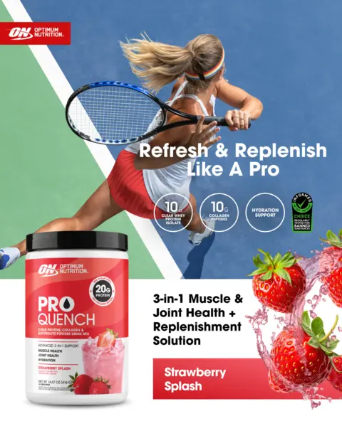 PRO Quench – an enhanced 3-in-1 sports drink mix that delivers refreshingly smooth fruit flavor, a total of 20g of protein, and electrolytes in every serving. With 10g of premium clear whey protein isolate and 10g of collagen peptides, you get a one-two punch that supports muscle and joint health.