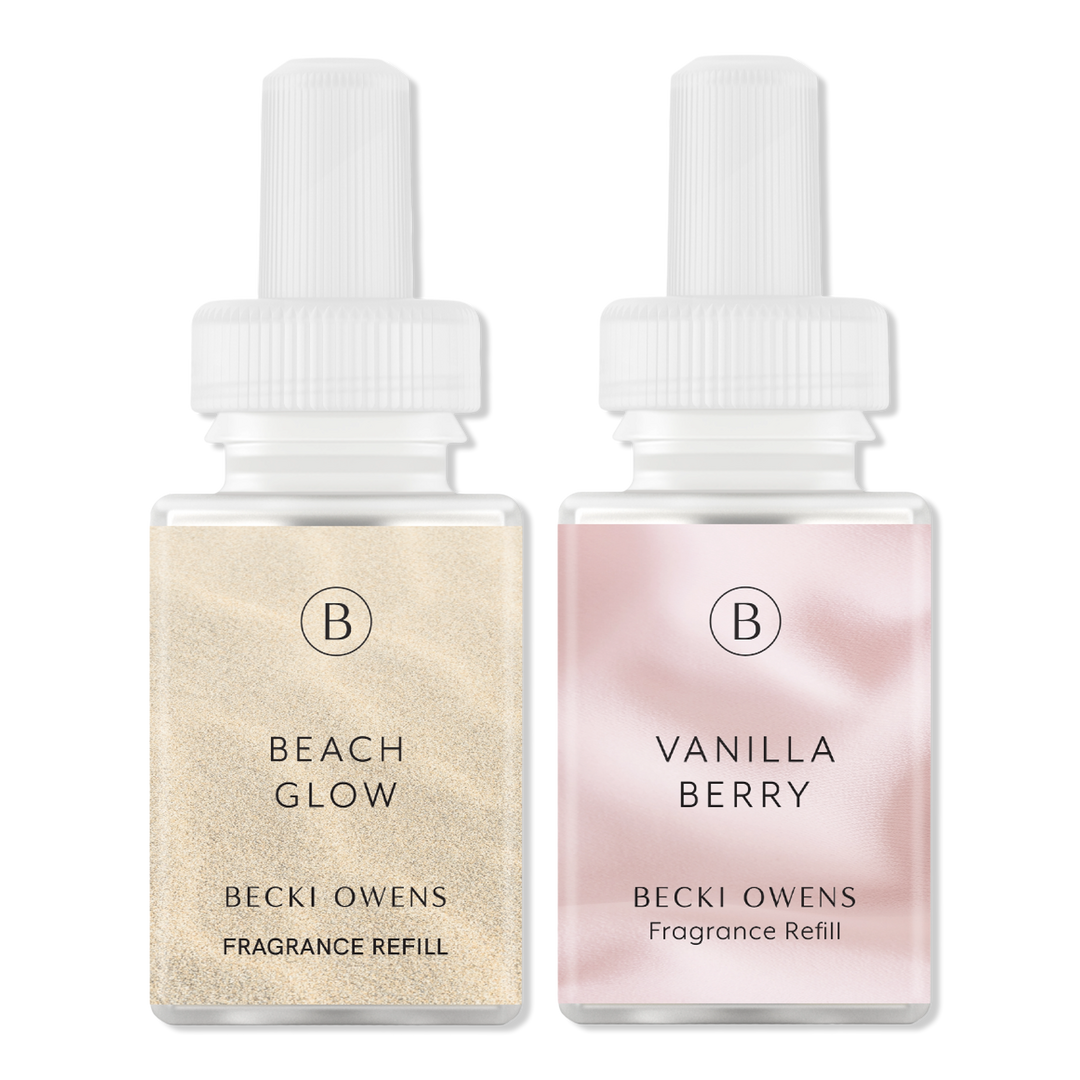 Pura X Becki Owens Vanilla Berry and Beach Glow. Enjoy sheer summer bliss with warm vanilla extract and sun-ripened berries paired with hints of turquoise ocean notes and sparkling citrus. Exotic white flowers, coconut, and fresh ozone bergamot make it easy to lose yourself in a lush island dream.