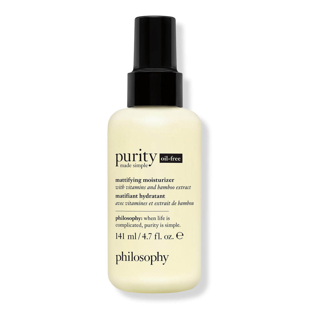Purity Made Simple Oil-Free Mattifying Moisturizer by Philosophy features a quick-absorbing formula that controls excess oil & shine, while providing 24 hour hydration.