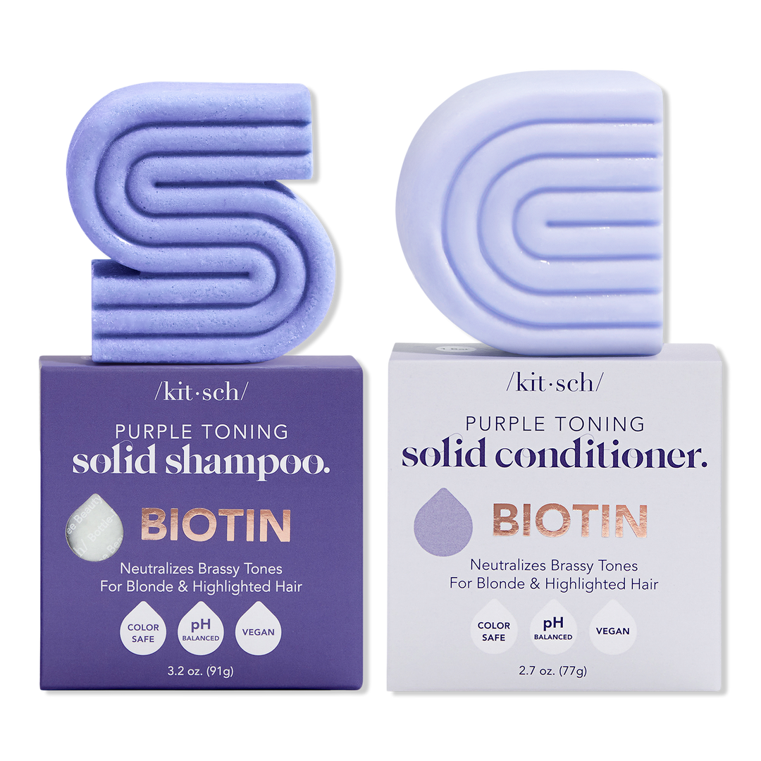 Kitsch Purple Toning Solid Shampoo and Conditioner Bar Combo Pack is the perfect toning shampoo for all blondes with color-treated, highlighted, or natural color. Neutralizes unwanted brassiness and yellow undertones. Enjoy smoother, stronger, and more vibrant blonde hair after just one use!