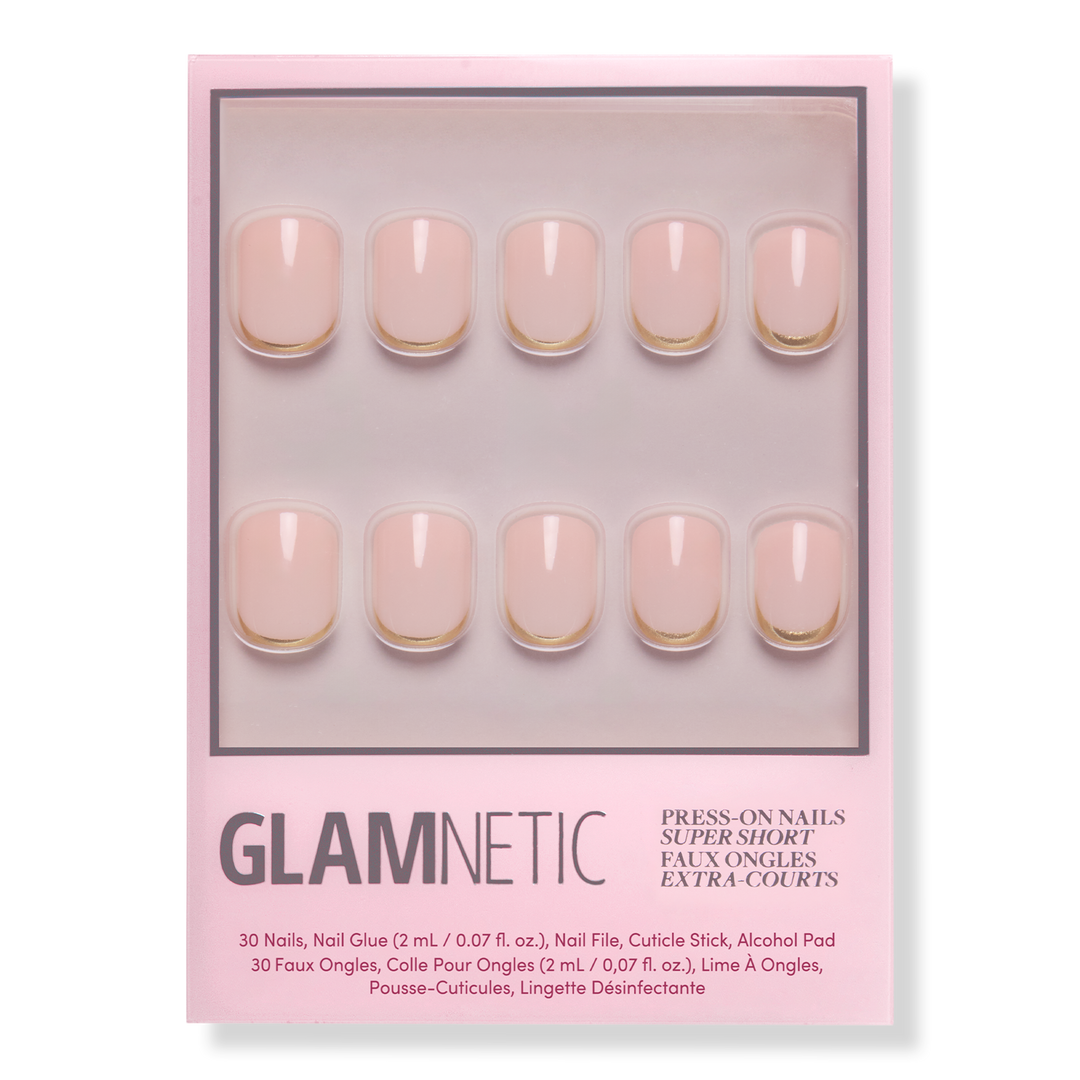 Remove any previously applied nail polish. Wash and dry hands. Gently push back cuticles using the cuticle stick and sanitize nails with alcohol pads. Size Glamnetic nails by placing on finger and select sizes best suited for your natural nails. Apply an even layer of glue to natural nails and the back of Glamnetic nails. Align Glamnetic nails with cuticle line and apply at a downward angle. Press down firmly and hold for 10-20 seconds. Apply all 10 nails and if needed, file or clip to achieve desired shape.