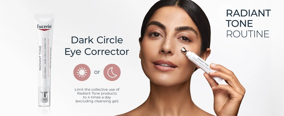 Gently apply Eucerin Radiant Tone Eye Cream Dark Circle Corrector to the under eye area. Limit the collective use of Radiant Tone skincare products to four times daily.