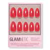 Remove any previously applied nail polish. Wash and dry hands. Gently push back cuticles using the cuticle stick and sanitize nails with alcohol pads. Size Glamnetic nails by placing on finger and select sizes best suited for your natural nails. Apply an even layer of glue to natural nails and the back of Glamnetic nails. Align Glamnetic nails with cuticle line and apply at a downward angle. Press down firmly and hold for 10-20 seconds. Apply all 10 nails and if needed, file or clip to achieve desired shape.