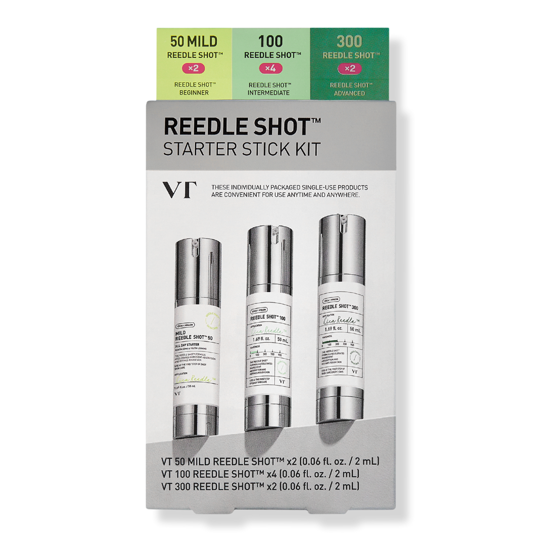 VT Cosmetics Reedle Shot Starter Stick Kit powered by VT’s exclusive Cica Reedle to boost skincare absorption and gently exfoliate for smoother skin. Includes sample pouches of Reedle Shot 50, 100, and 300 - experience varying intensities of Reedle Shot care in one set.