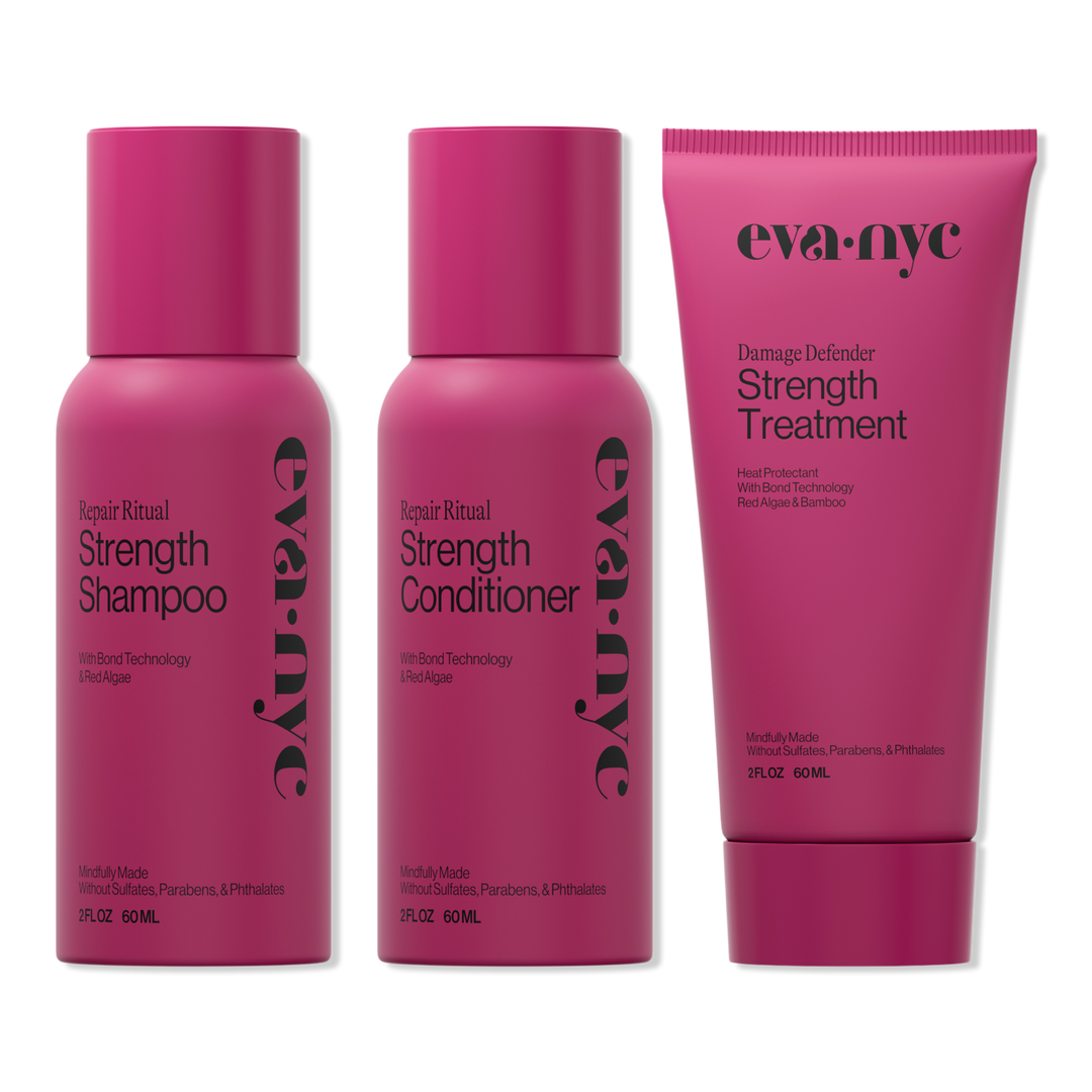 Eva Nyc Repair Ritual Strength Starter Set system combines science and nature for hair that is strengthened from the first use, visibly improving damaged hair and preventing future damage from heat, bleach, color, and chemical services. Strands are left shiny, strong, and full of vitality.