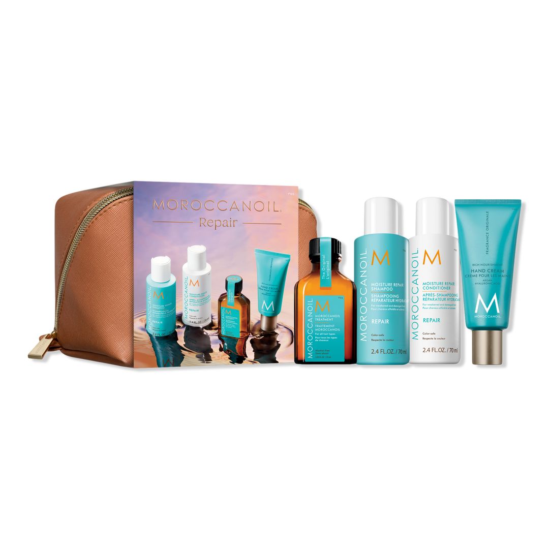 Moroccanoil Repair Travel Set is a trial-size set featuring Moisture Repair Shampoo and Conditioner, Moroccanoil Treatment, Hand Cream, and a free cosmetic bag.