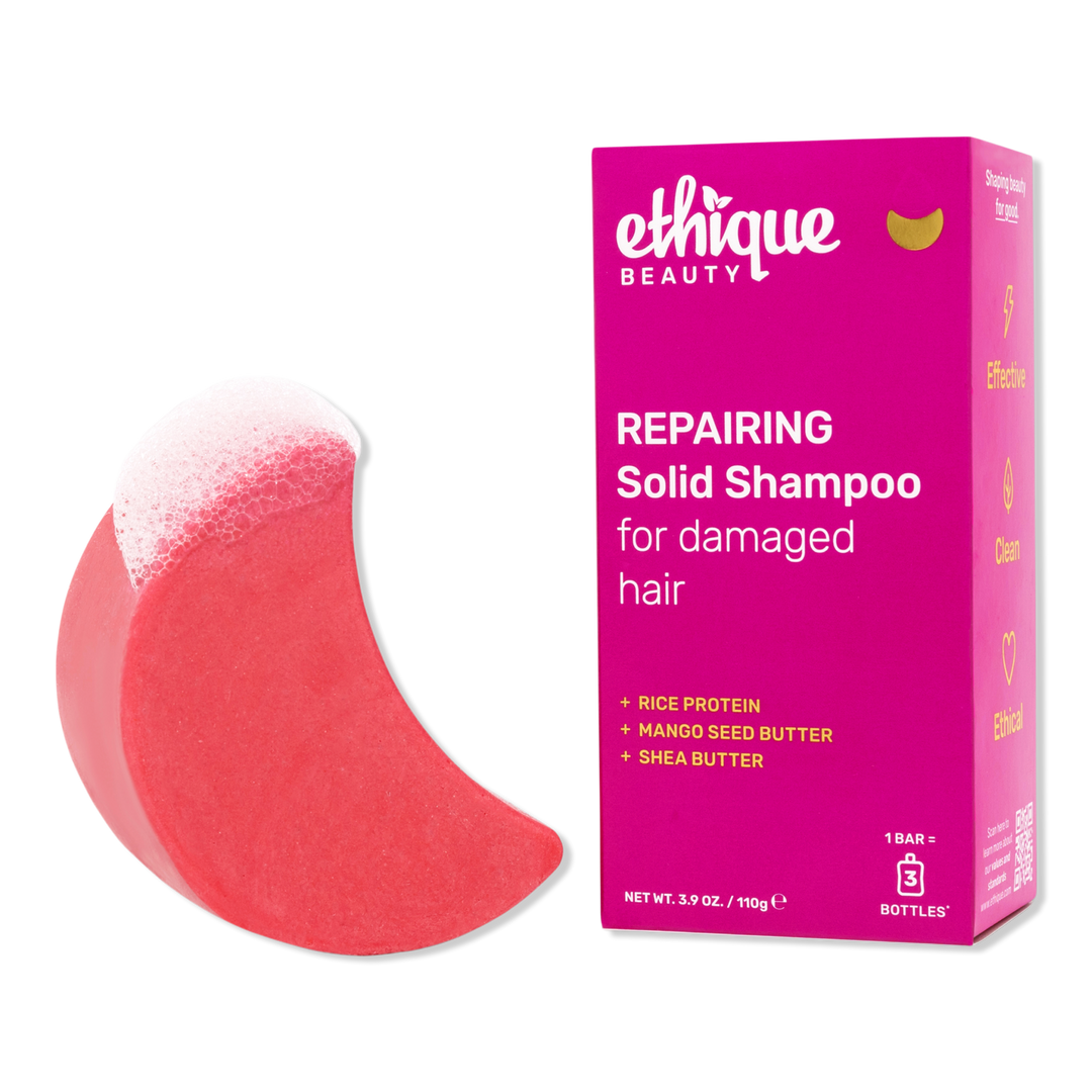 Damaged hair? Ethique Beauty's Repairing Shampoo with rice protein strengthens brittle locks, prevents damage and split ends, and smooths with mango butter.
