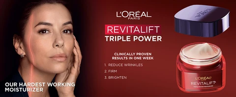 L'Oréal Revitalift Triple Power Anti-Aging Face Moisturizer is an anti-aging face moisturizer to visibly reduce wrinkles, firm and brighten skin in 1 week with Pro-Retinol, Hyaluronic Acid and Vitamin C.