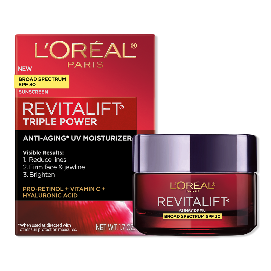 L'Oreal Revitalift Triple Power Face and Neck Moisturizer SPF 30 is formulated with top derm-proven ingredients and now with broad spectrum SPF 30 to visibly reduce wrinkles and neck crepiness, firm face and jawline, & brighten.