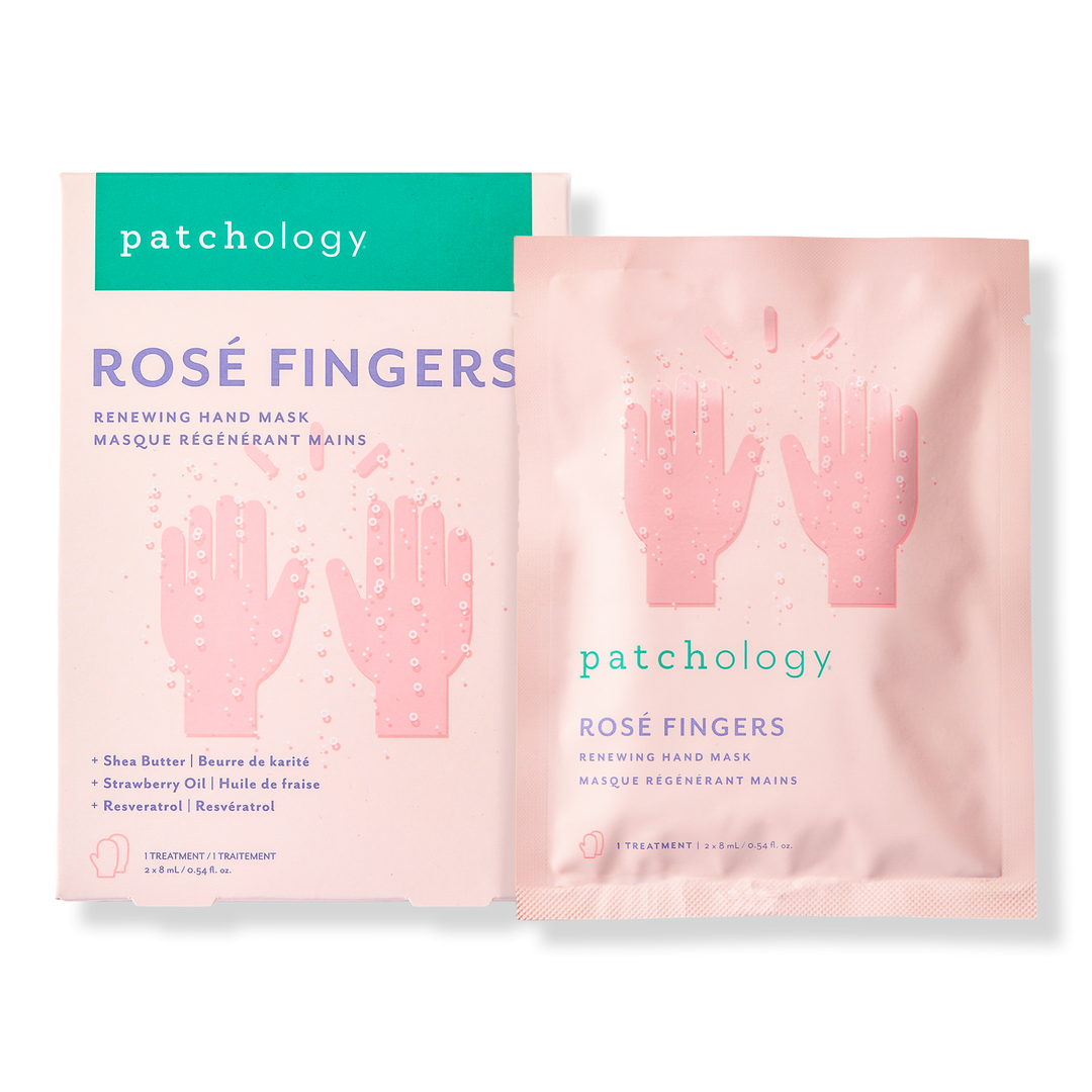 Patchology's Rosé Fingers - Renewing Hand Mask intensely hydrates and visibly renews dry hands while basking in the light, effervescent scent of rosé, delivered in a rose-gold foil mitten.