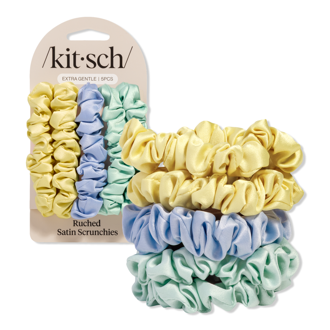 The Kitsch Ruched Satin Scrunchies 5pc Set lets you create endless styles without damaging your strands. Made from ultra-soft fabric in sunny yellow, seafoam green, and sky blue, these hair ties are gentle enough for all-day wear and help prevent tangles, frizz, and breakage.